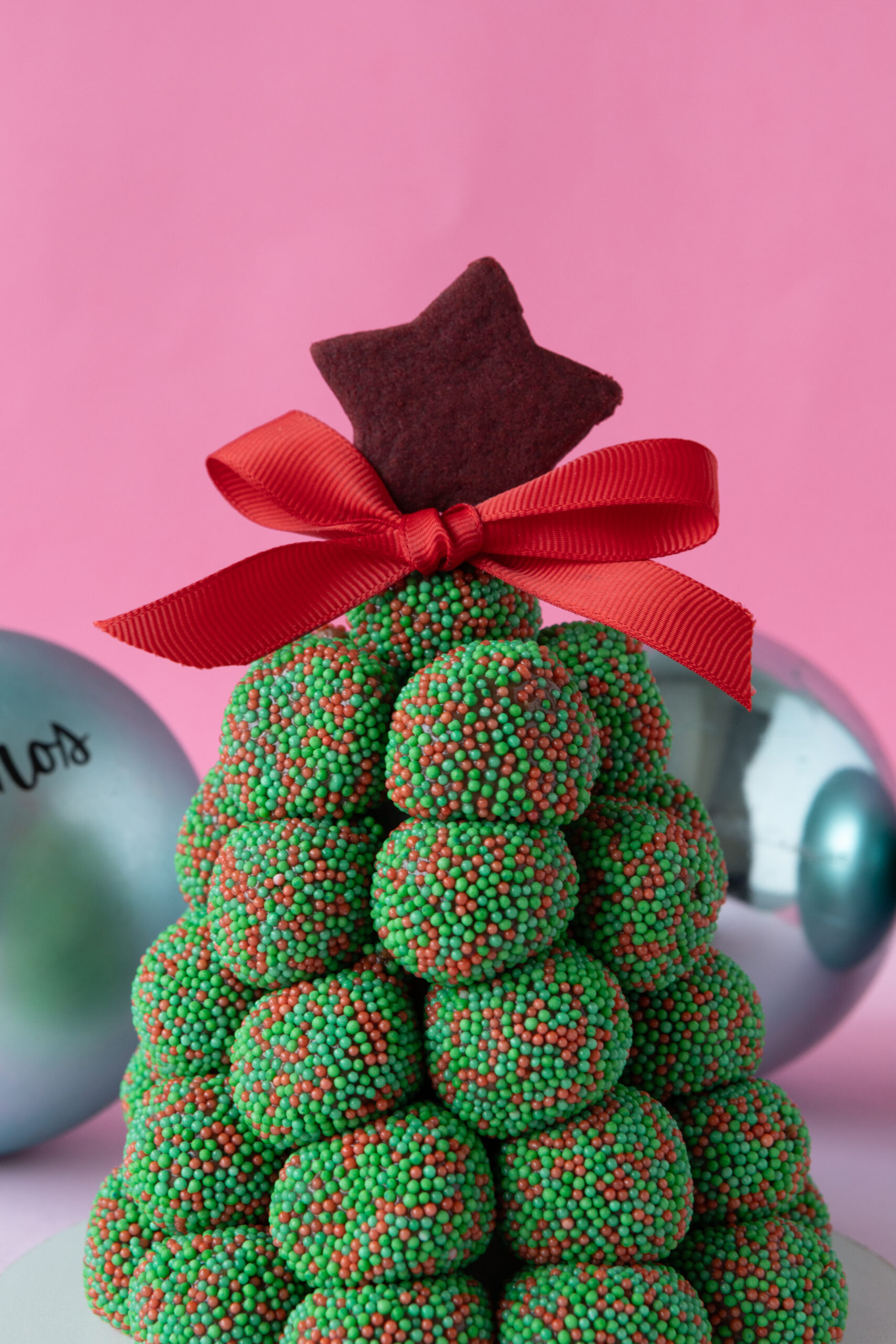 38 brigadeiros belga com granulado dragê em formato de árvore. Acompanha bolacha amanteigada em cima e laço de tecido.