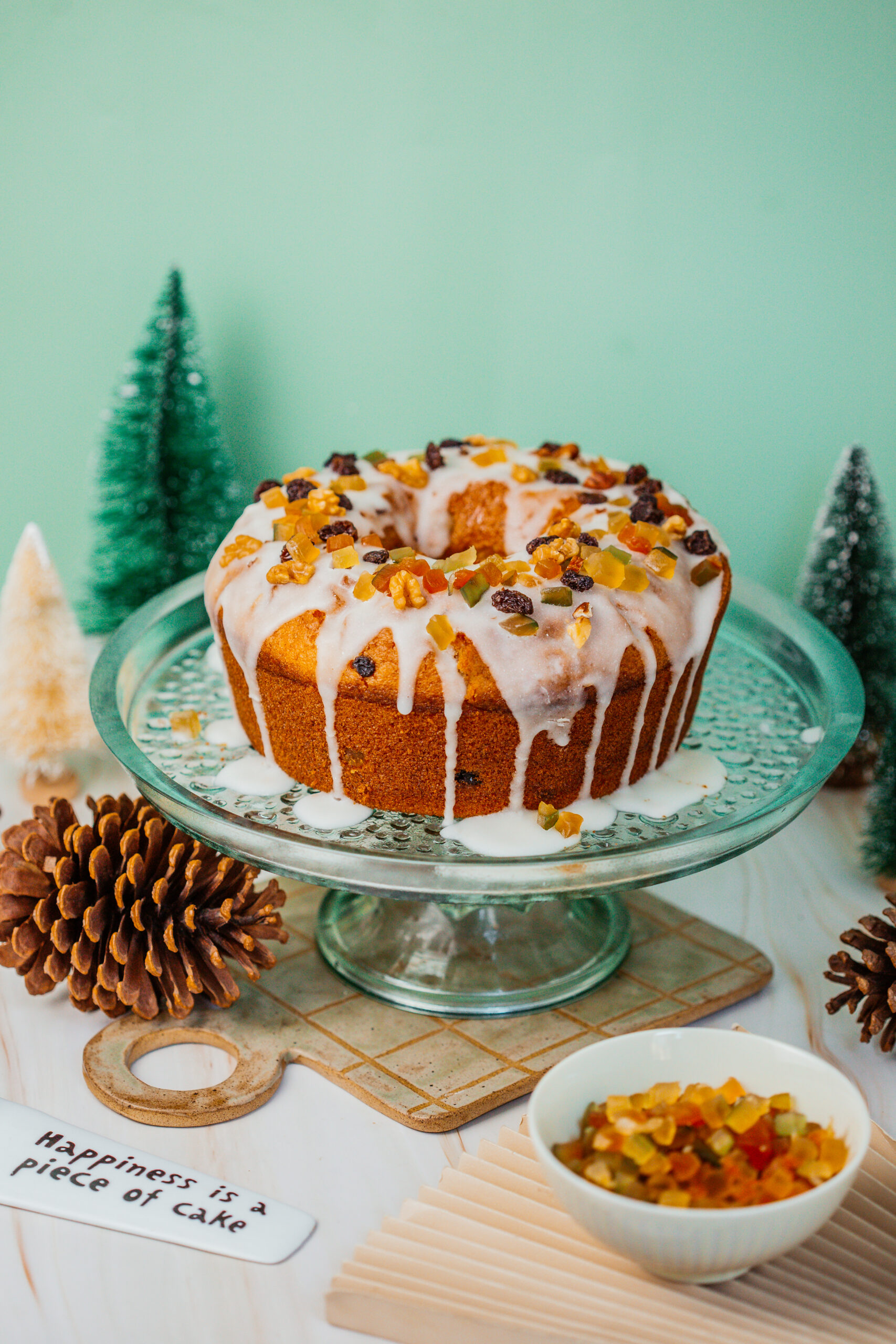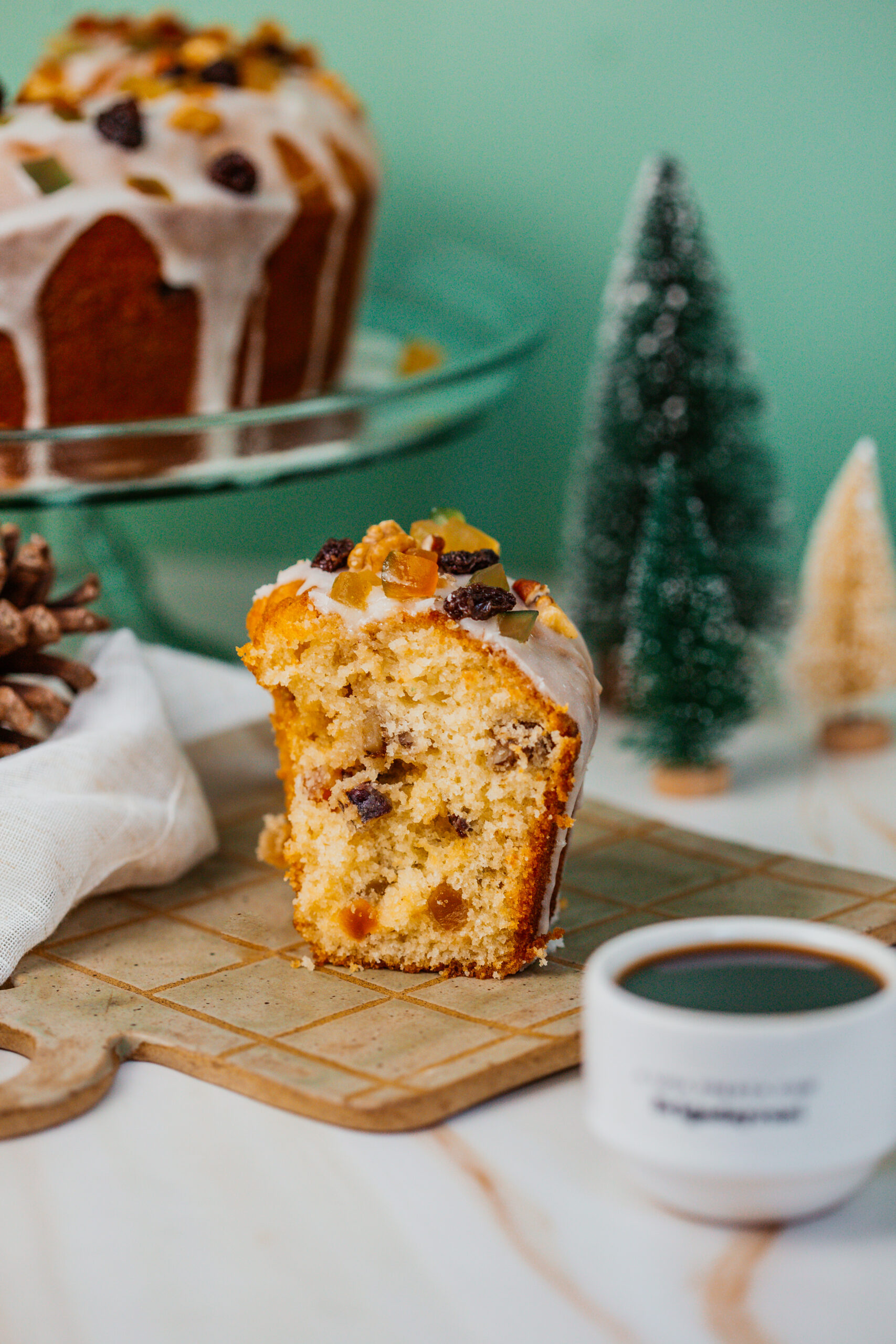 bolo feito com especiarias, frutas cristalizadas, uva passa e puro gosto de natal.