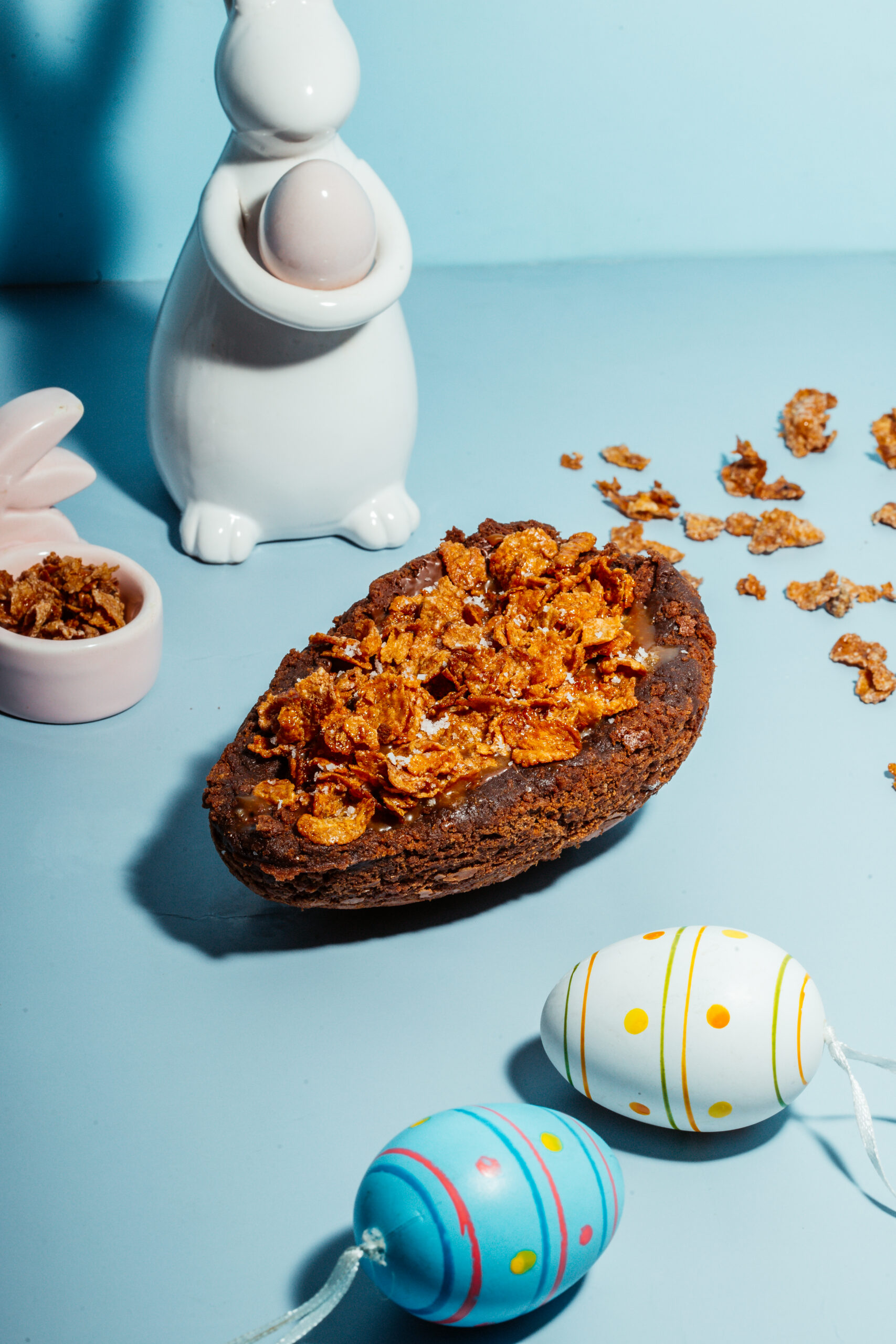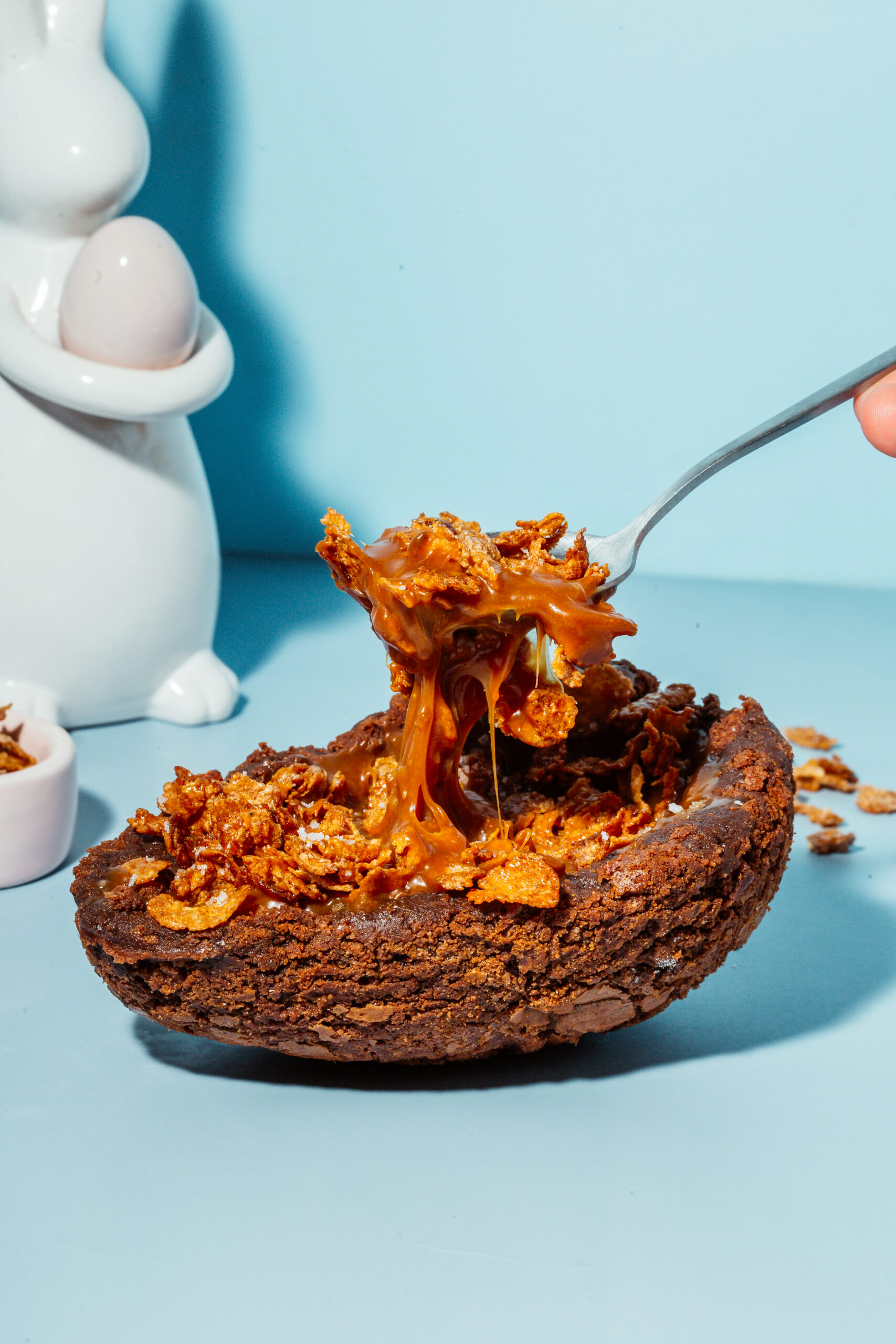 Casca de ovo feita de brownie recheada com caramelo salgado e finalizada com sucrilhos crocante com flor de sal. (Aprox. 400g)