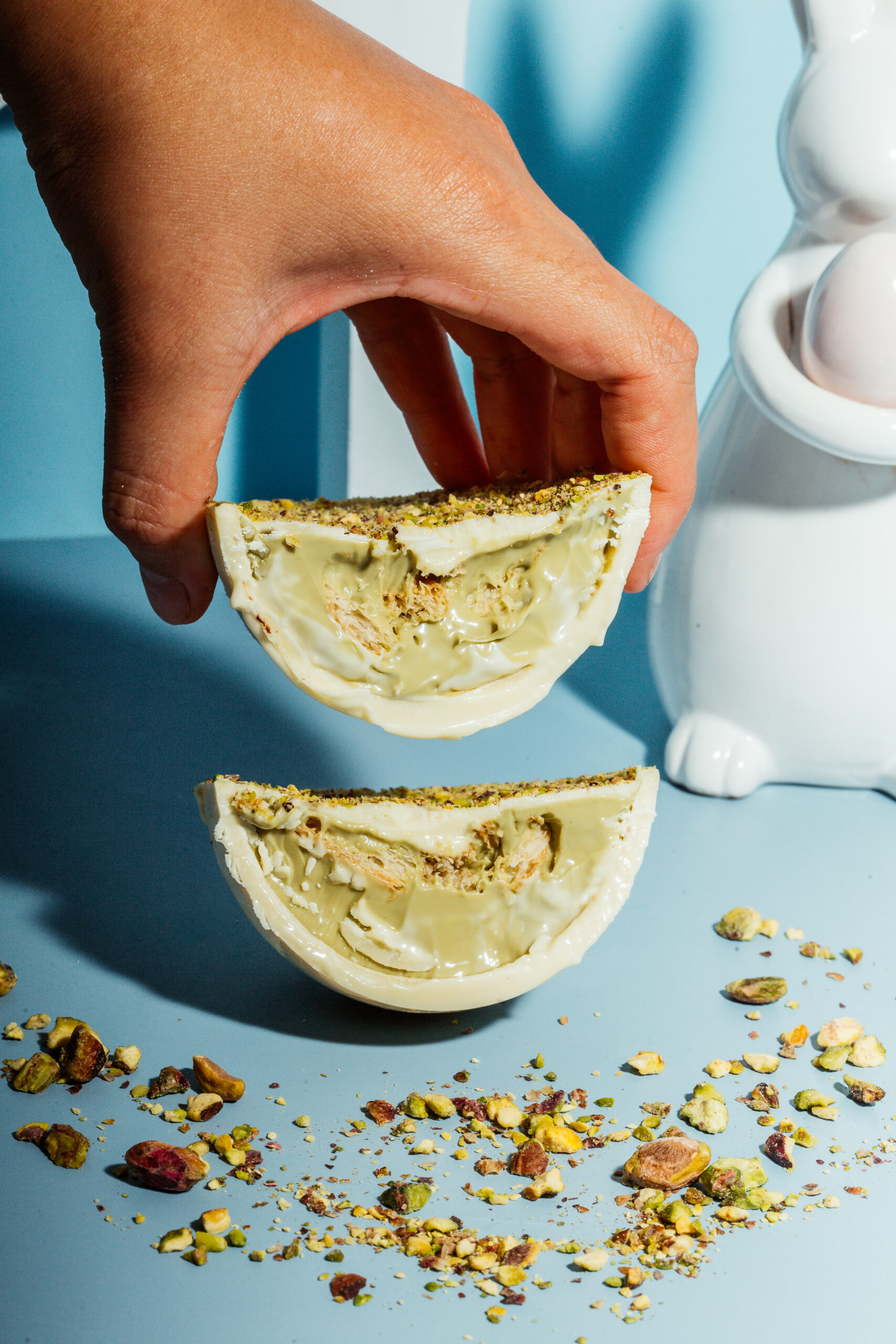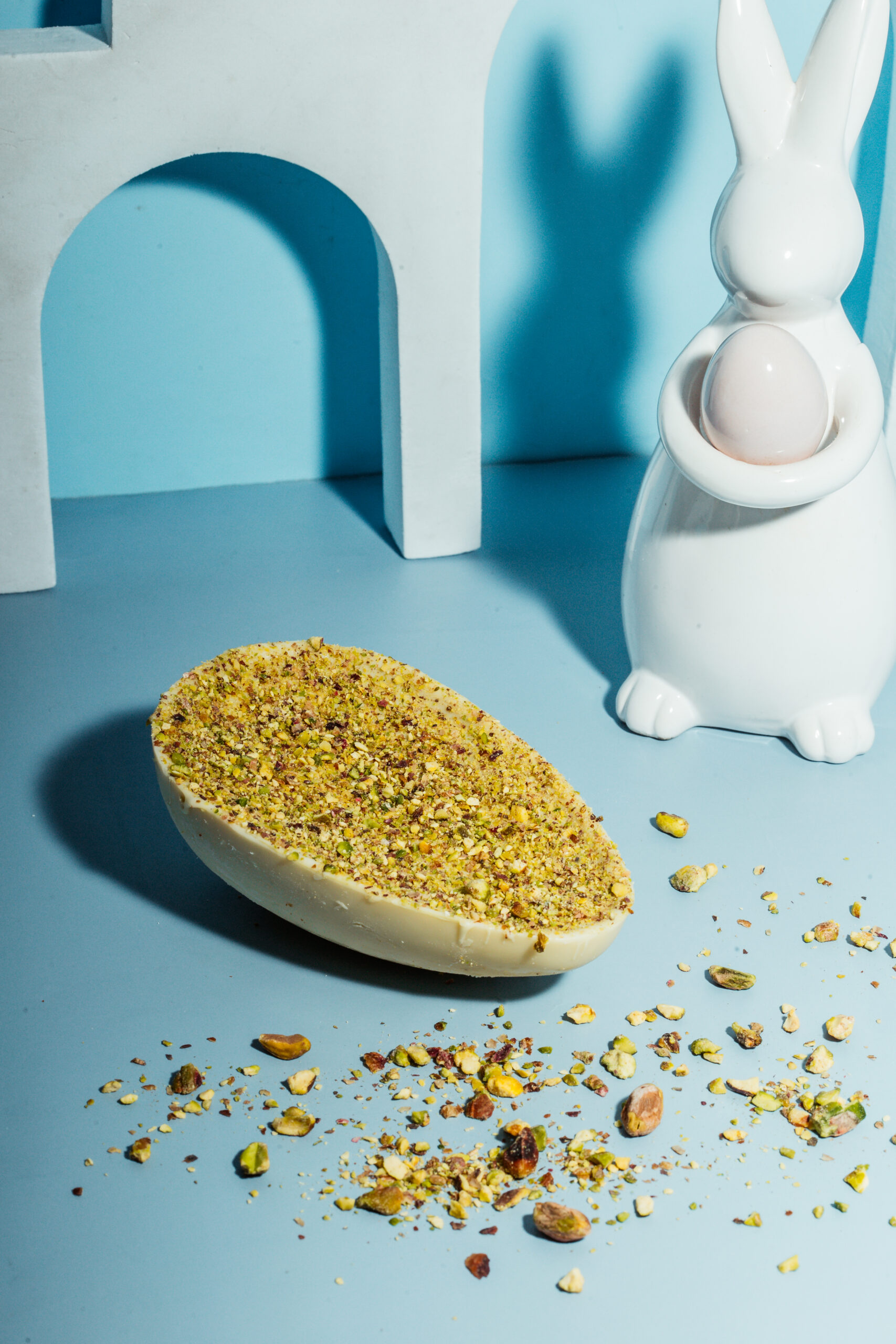 Casca de chocolate branco recheada com creme de pistache e bolacha crocante, finalizado com mais chocolate branco e farofa de pistache. (Aprox. 280g)
