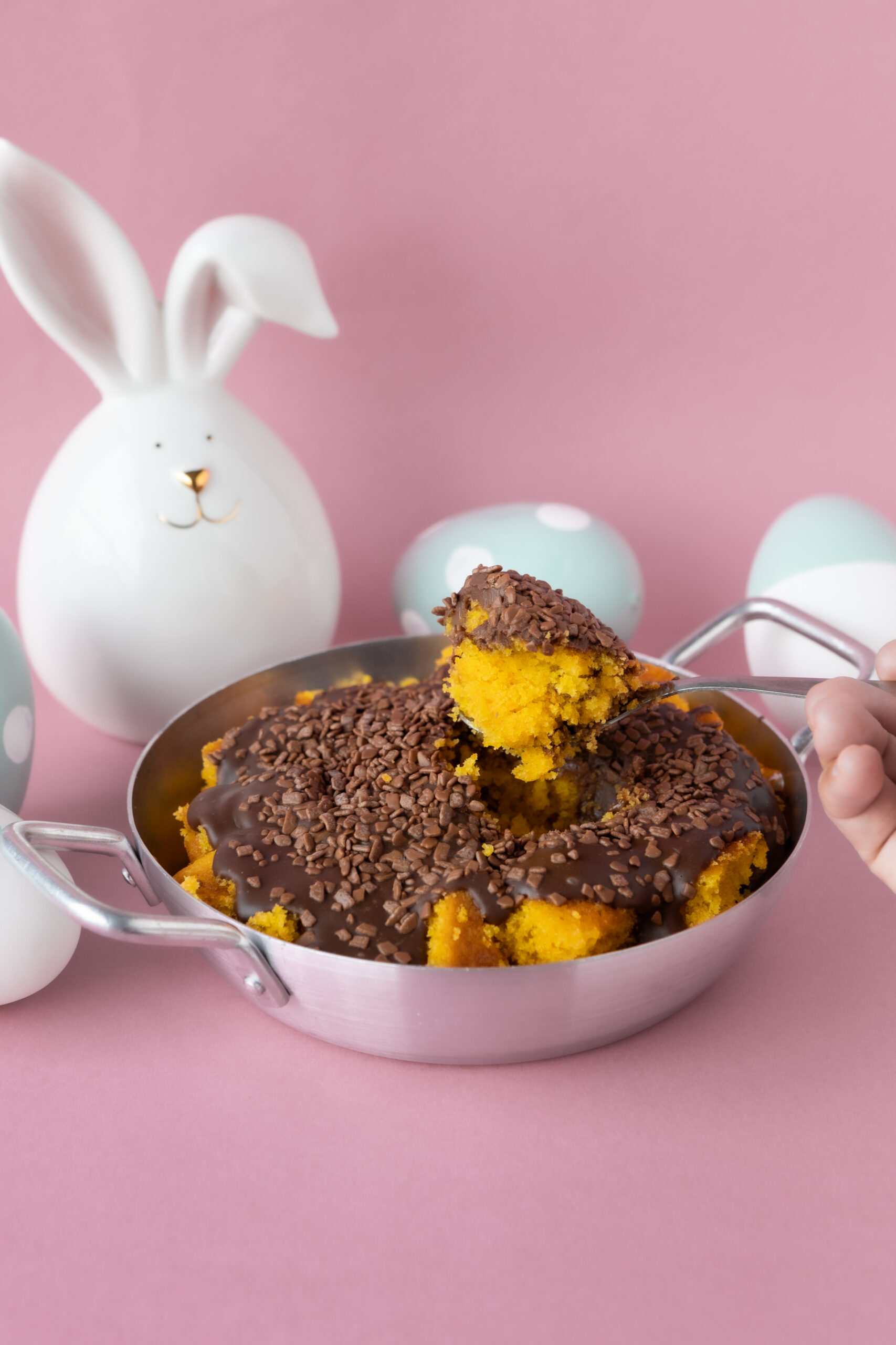 Bolo de cenoura de panela finalizado com brigadeiro belga.