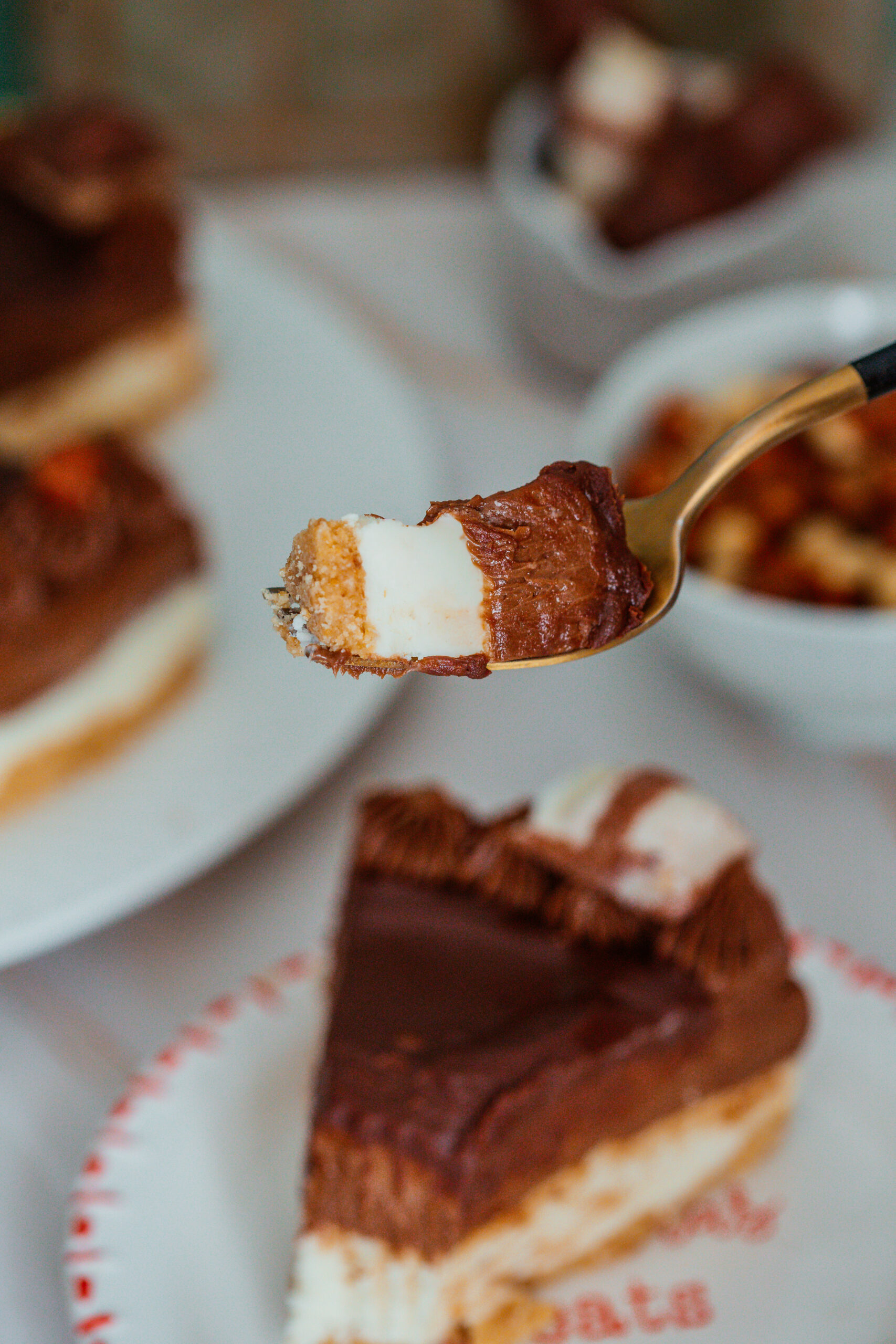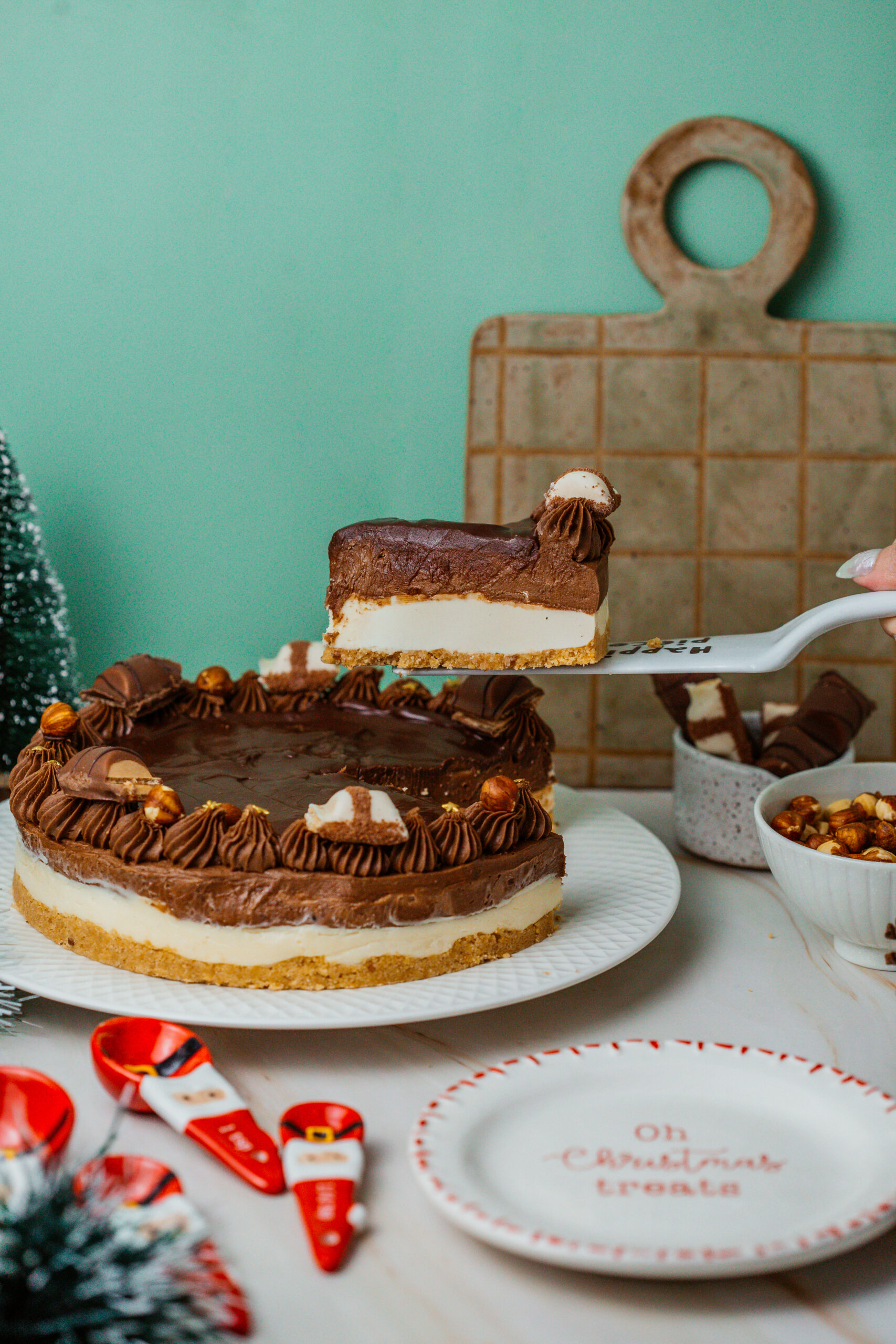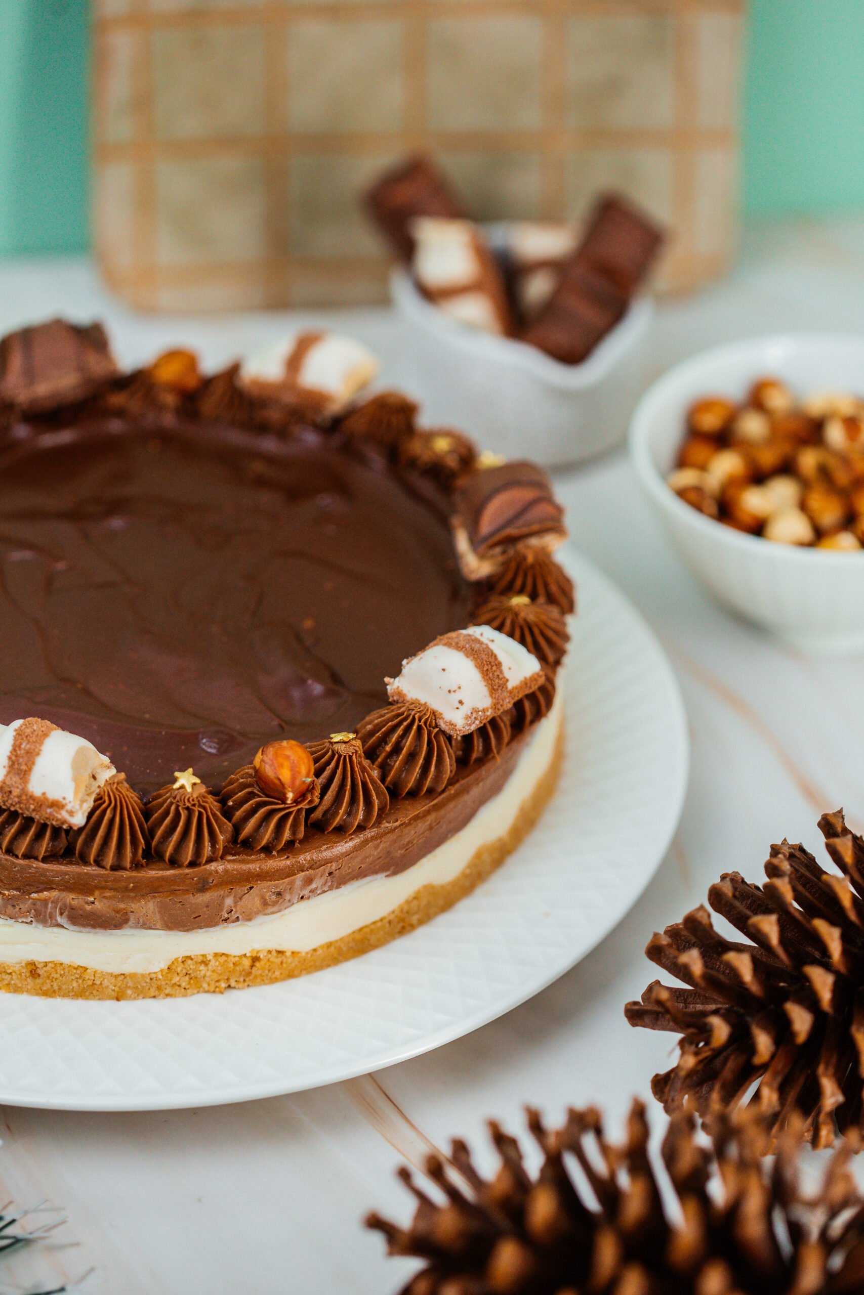 massa de torta de baunilha, recheio de creme branco com pedaços de avelã e creme de kinder bueno e outra camada com creme de nutella.